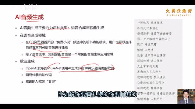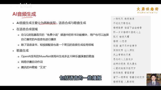 然后第二个呢是a i的音频成音频的生成。那么在a i音频生成上呢,这个领域已经也非常非常成熟了啊,包括一些有声读物的制作呀,包括语音的一些播报啊,对吧?短视频的配音啊,就目前我们在网上刷到的短视频,可能已经有一半以上都是用a i呢去生成的的配音,已经不是有人来说了。啊。