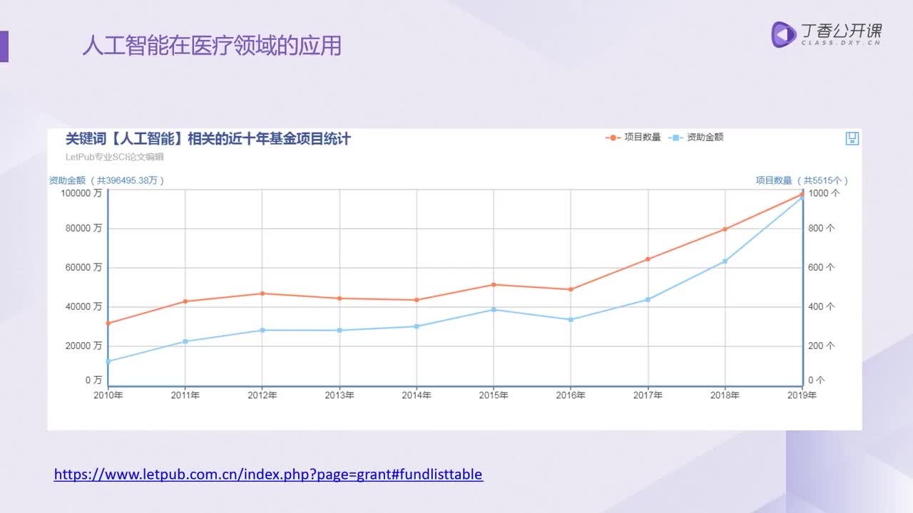 现在利用人工智能深度学习的技术做出的诊断呢,可以说是已经超过了人类专家识别的水平了。再比如说癌症的治疗,我们知道肿瘤治疗的时候呢,是要知道肿瘤的病理类型的,甚至是具体的分子或者是基因分型。既往呢这些都是要做病理检查的。但是现在我们通过影像组学的方法,仅仅利用影像学检查的资料,通过影像组学提取肿瘤影像的特征,再利用人工智能的方法进行分析,就能在一定程度上反映出患者病理和基因型表达的结果,甚至可以预测患者对治疗的反应,从而指导个体化的治疗。其实影像组学的概念呢从出现到现在啊,也只不过是八年的时间而已。但是呢这种医疗大数据分析的观念,其发展的潜力和优势显然是毋庸置疑的。随着影像技术和人工智能技术的发展,他们在医学领域的应用以及发挥的作用肯定会越来越多。我们可以看一下国家自然科学基金有关人工智能的立项情况。