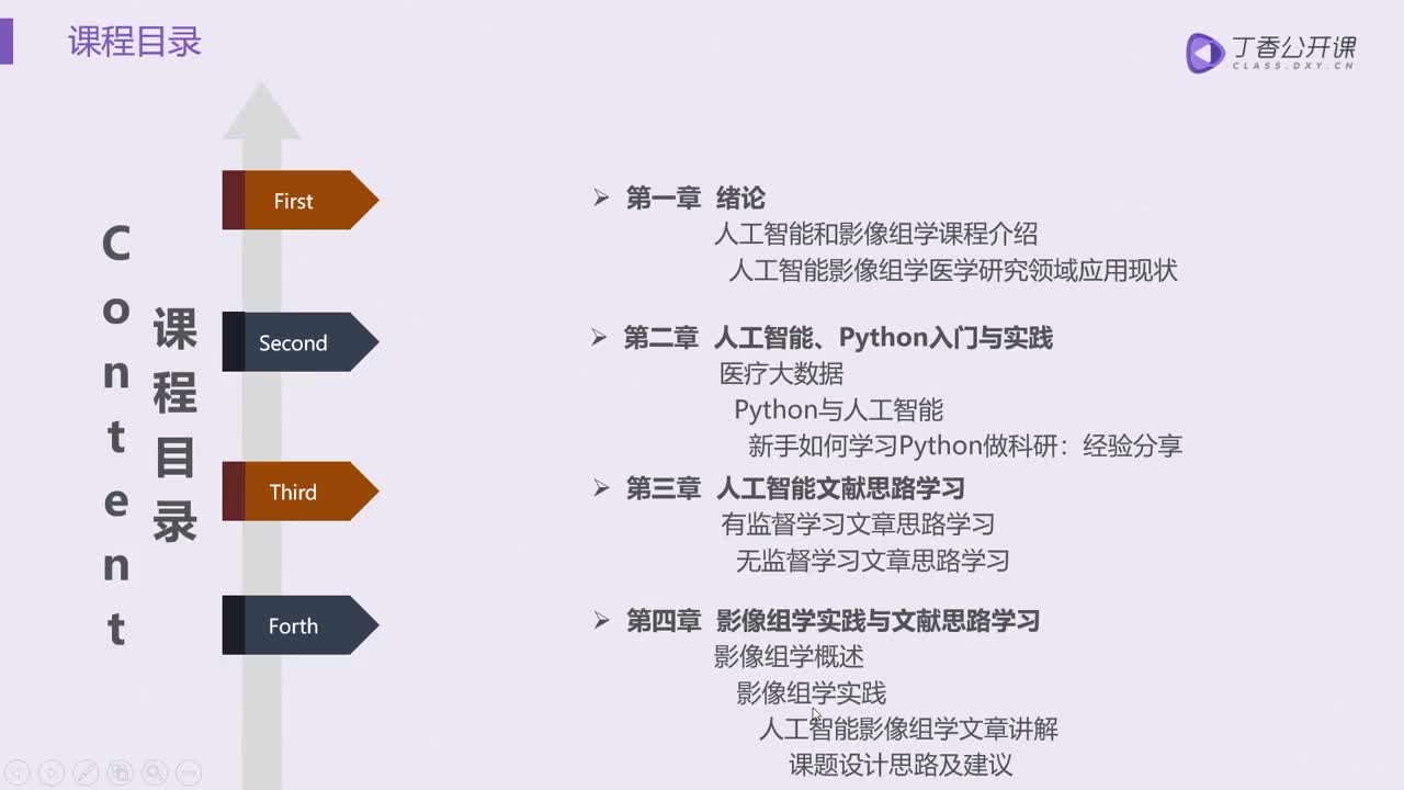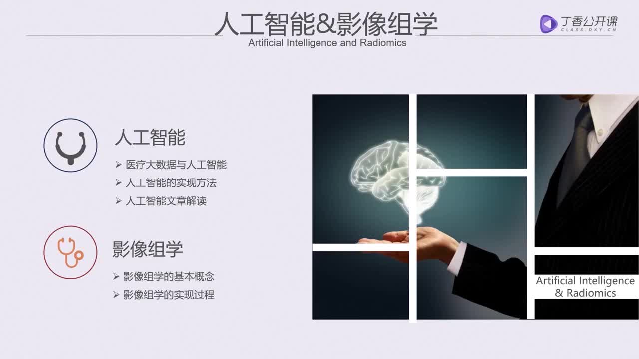 对传统研究方法的冲击肯定是非常巨大的,堪称是这个降维打击啊啊这不是我这么说的是当时的报道呢就这么报道的。想必大家看到以上这些人工智能的例子,看到有这么多成功的案例的时候啊,就都很眼热,也很好奇了。想知道自己能不能也利用人工智能的技术来做出一些研究呢?我觉得肯定是可以的啊。因为你听完这门课程之后就知道了,人工智能呢并没有大家想象的那么复杂。那么咱们这边的课程的内容呢,主要讲两个主题,一个是人工智能,一个是影像组学。讲人工智能的时候呢,我会给大家介绍医疗大数据与人工智能的关系,会给大家讲解人工智能实现的方法,也就是机器学习。也会详细的和大家讲一讲人工智能应用于医学领域都发了哪些文章。看看别人都利用人工智能的技术做了哪些东西。