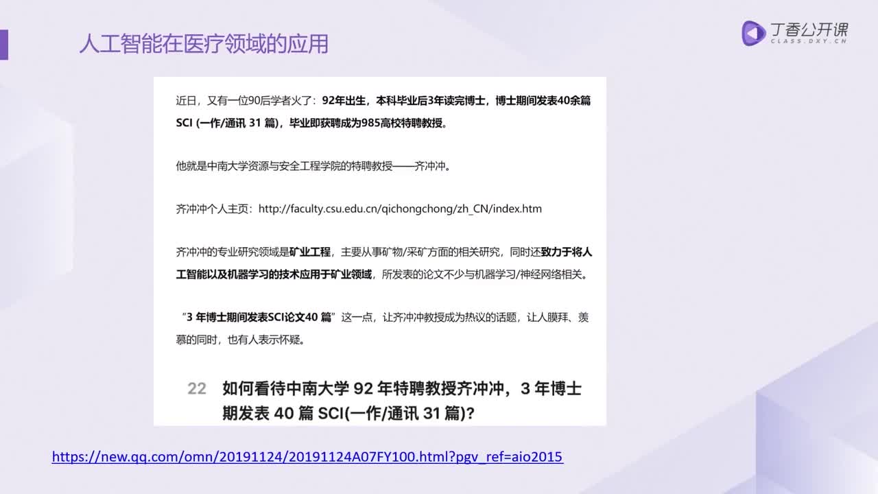 比如说咱们既往分析病人的信息,一般都只是分析患者的某一个方面。治疗方案呢一般也是针对某一类病人制定的。病人对治疗的反应如何呢?我们也并不清楚。但是利用人工智能的手段,我们既可以综合分析患者的各个方面信息,来对患者进行诊断。也可以综合分析患者的各个方面,来对患者进行更细致的分类来指导治疗。就不是像以往的那样,单一的依靠某一个指标来对患者进行分类了。这是人脑也是以往的研究方法呢不可能达到的。可以说了解人工智能对我们的临床实践呢、科学研究都有重要的意义。