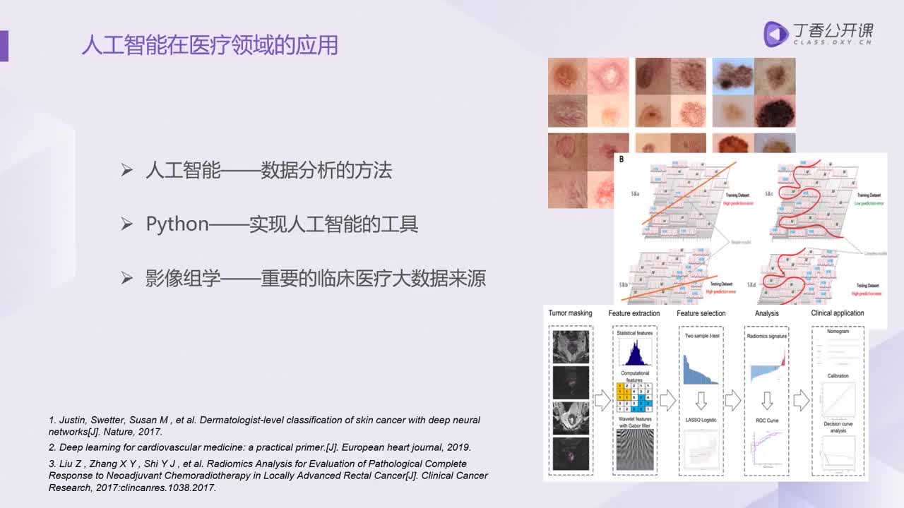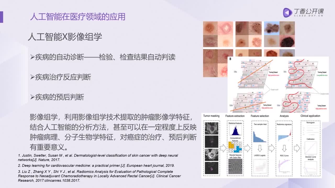 利用好这些特征呢,就可以让我们对疾病有更深的认识。而提取出来的这些特征,我们一般用什么方法进行分析呢?啊,基本上就是用人工智能的方法来进行处理。这也是我们这门课程会将人工智能以下组学的方法一起讲的原因。这些东西呢以后在课程中我们都会详细的讲。那么人工智能影像组学在医学领域有哪些应用呢?其实这两年有关大数据和人工智能的概念这么火,大家肯定都看过相关的报道或者是新闻。最热最火的可能就是疾病的自动诊断了。比如说有人利用人工智能的技术,将皮肤病的诊断自动化了。再比如说还有病理图片或者是心电图的自动诊断。
