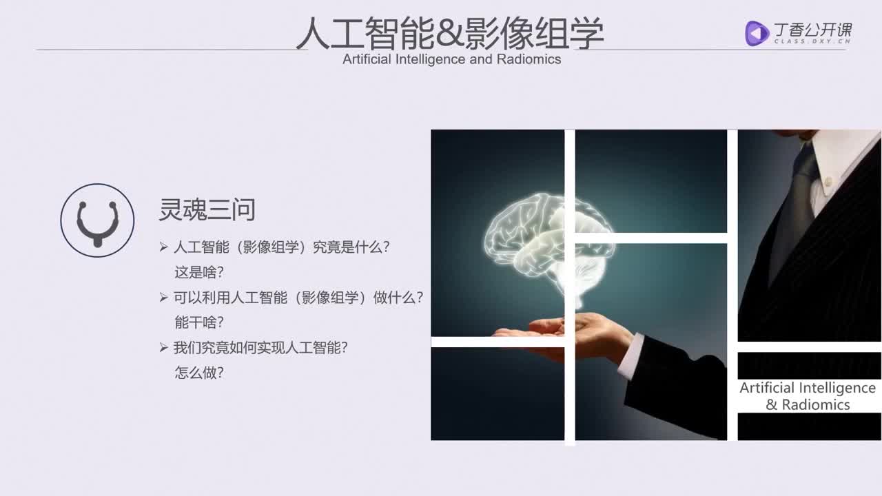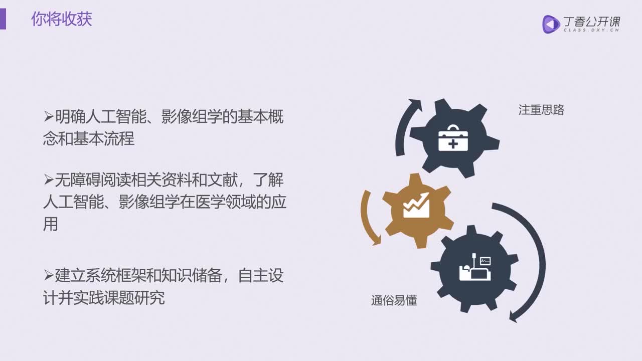花这么长的时间去讲课,咱们又不是本科教学啊,这么长的时间内你没有办法步入实践,没有办法开展课题。我觉得呢会错失很多的东西,还有机会。我相信呢大家都很忙,时间和精力呢都是消费不起的。那么咱们这门课程准备怎么讲呢?我设计这门课程的初衷是先帮大家建立起人工智能还有影像组学的基本框架,了解人工智能还有影像组学的基本概念。然后已经用这些技术做科学研究的基本思路,还有基本方法里面的细节呢先不给大家讲。比如具体某一个机器学习的算法啊,先不讲也讲不完。我希望呢能通过最短的时间,先给大家把这些最重要的内容讲完。然后大家有什么想法呢,就可以马上进入实践开展课题了。