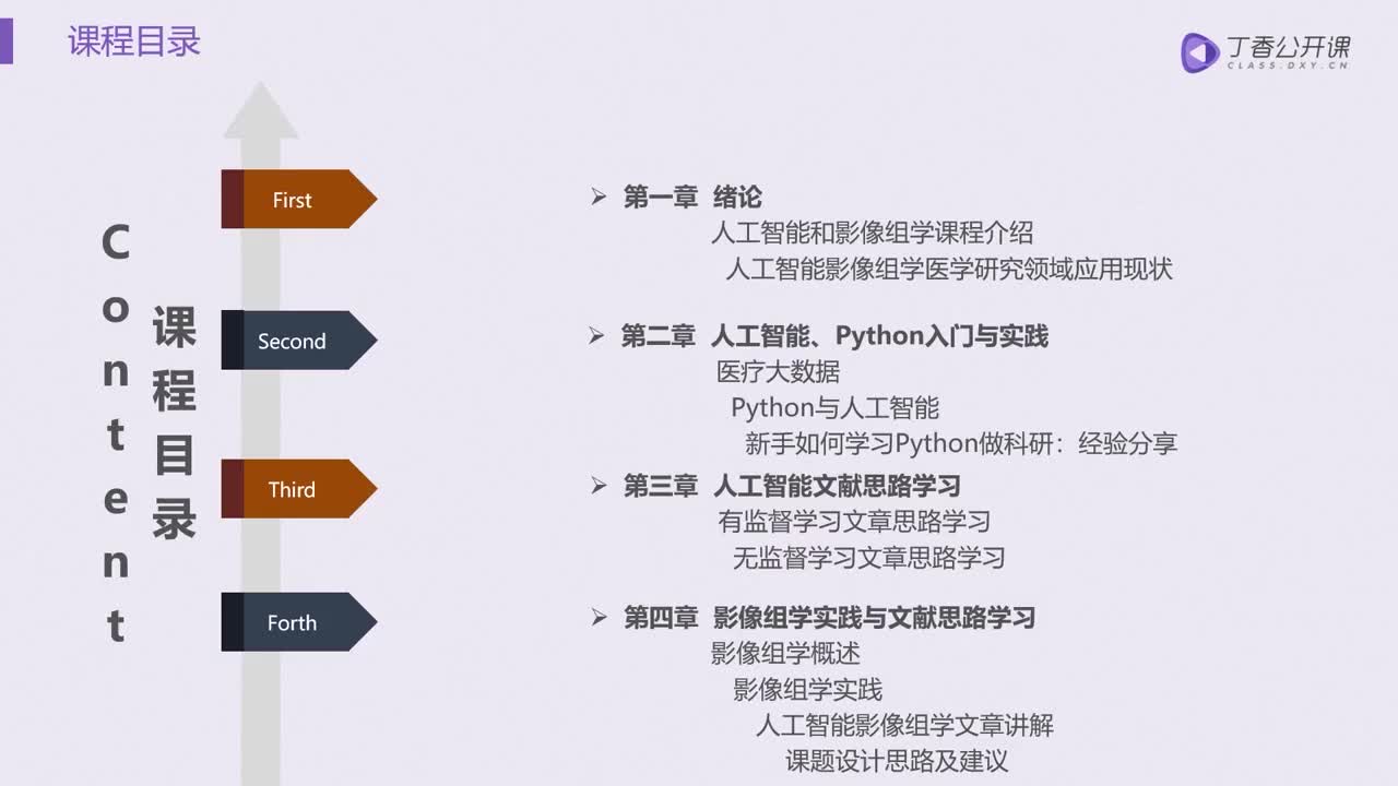 咱们临床收集数据的过程呢,可能需要经过几个月甚至一两年的时间。在这个时间里,大家如果再想学习相关的知识,可以细致的去学。而不是我先花几个月的时间给大家介绍完这些具体的方法,然后你再去设计课题。这么做的话时间就浪费的太多了。啊,你想开始一个课题呢,是不需要这么多细节上的知识的。那么具体的内容,首先咱们第一章的内容啊,包括现在这一节课主要是给大家做个介绍。简单的呢聊一下人工智能和影像组。斜下节课呢则是通过在palo mt上检索的方式,看看这些技术在医学领域呢都有哪些应用。