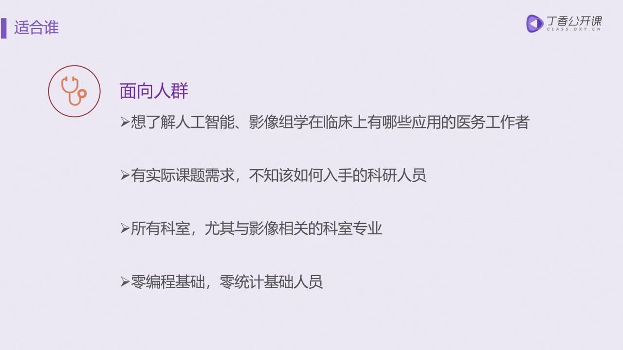 也学习一下大牛们做科学研究的思路。影像组学这一块呢也会给大家讲清楚它的基本概念,介绍它在医学领域有哪些应用,也会为大家演示一个完整的影像组学特征提取的过程。这个部分呢现在应该在全网应该都是比较难以找到的。现在网上的资料呢基本上都是一块一块的,你很难把所有的东西都串联起来。但是咱们这里呢会把完整的流程全部演示给大家。那么我们这个课程主要面向的人群呢,一部分呢我觉得可能是听过相关概念,然后想具体了解人工智能影像组学在医学领域有哪些应用的。另外一部分呢可能是有实际课题需求,然后不知道该如何入手的。这些人呢可能包括本科生、研究生,也有可能是已经工作的临床医生,甚至是科室主任。
