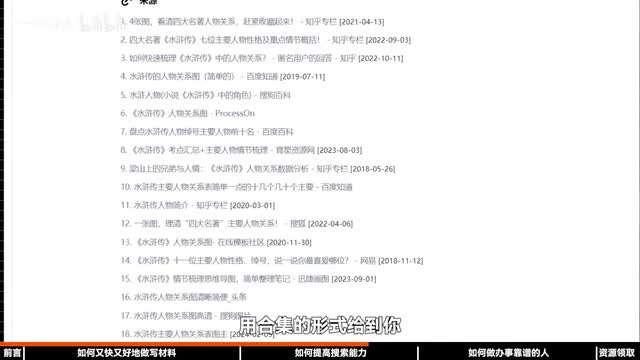 第二,学会用a i来去打破搜索壁垒,去这个a i搜索网站输入你想要的问题,然后呢a i就会自动搜集解答,还会贴心的把你的信息来源用合集的形式给到你,方便核实资料的来源。右边呢甚至还提供了思维导图和大纲的形式。你看这不就直接把一百零八个好汉的人物关系八碎的给你喂嘴里了。