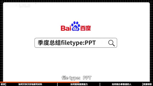 第三,想要搜索特定文档的格式就使用file type命令。比如想要去搜索季度汇报的p p t文档格式,第三季度总结file type small好p p t,这样搜索结果就是包含季度总结的p t文档。怎样换成其他的文档格式也能够获得你想要的结果。