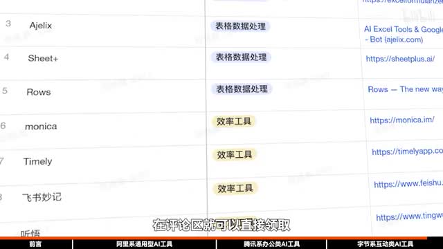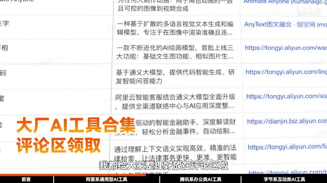 如果你在开会的时候打开它,还可以实时记录不同人的发言,快速做好会议纪要,还有其他阿里出品的a i应用,以及其他国内有实力的大厂出品的免费ai工具,我都给大家整理好放在评论区啦。你可以根据对应工具的简介找到想要的工具。此时应该有一个良心飘在公屏上,整理不易,求求三连啦。接着是竹逊节呀。
