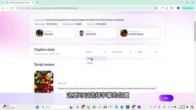 好,next这里你可以检查一下你刚才的这些选项。比如说这个是你的提示词啊,视频的时长三十秒钟,语言是英语,radio的调性是informative caption接下来是字幕,这里可以选择字幕的位置,比如说在下面或者是在中间。这个我们选择在中间加入知识星球,获取更多ai技术,星球号五三三八二二三零。然后这个是字体lucky the guy,这是它默认选择的。
