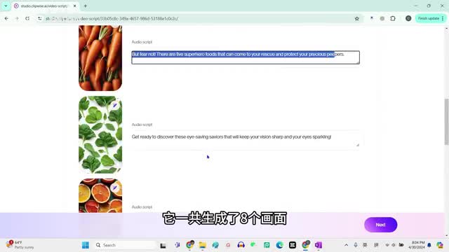 这个是字母的颜色,是黄颜色。ok我们就选择黄颜色,下面是每一个画面,然后它自动生成的这个文本,它一共生成了八个画面。如果你对生成的画面或者是文本不满意的话,你还可以编辑重新生成。好,我们来生成next。