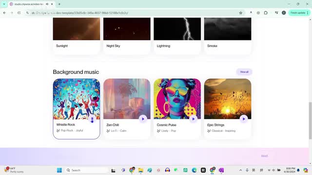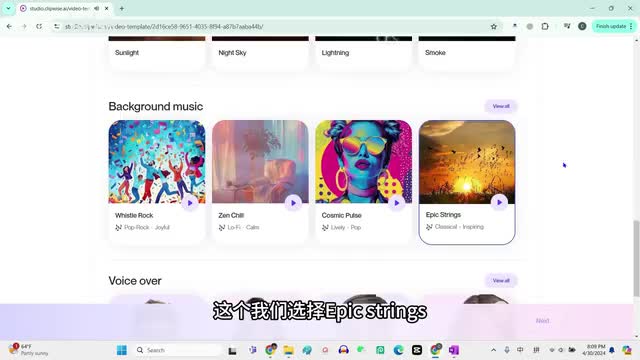 接下来video overlay,它就是在生成的视频上面添加一层。比如说这个阳光呀,这个是夜晚的星光,这个是雷电呀,这个是烟雾。我们这个基本上不用添加这个,下面这个是背景音乐,背景音乐我们来试听一下。ok我们选择这个heart field melody,接着就是配音with cloud machine learning your application interpret images,我们就随便选择一个max smith。