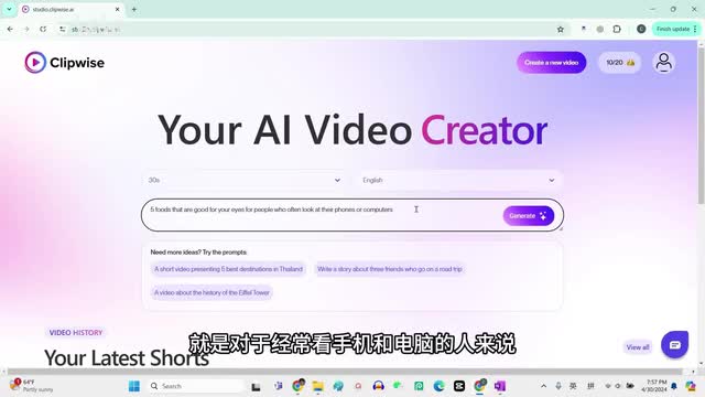 我相信随着软件的开发,它很快也会支持中文。那这里我们选择英语,这里就是输入一个提示词,我们来随便输入一个提示词,比如说健康类的。就是对于经常看手机和电脑的人来说,给出五种对眼睛有益的食物,然后点击生成。下面是一些设置video tone,这个我们就翻译成视频的调子调性。