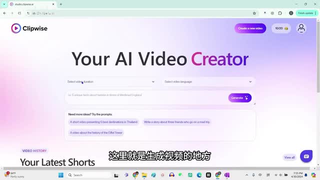我们打开clip voice网站注册一个账号,我这里就用我自己的google账号登录进去。它的界面非常的简洁,这里就是生成视频的地方。你可以选择视频的长度三十秒、四十五秒或者是六十秒。我这里给大家演示,我就选择三十秒,选择视频的语言,这里有英语、西班牙语、法语和德语。