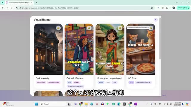 view all, 那它有各种不同的风格和主题,这个比较适合恐怖故事。这个是彩色的漫画,这个也是动画风格的。这个是三d皮克斯风格的manga style,日本动画风格的cinematic,这个是电影风格的。ok我们这里就选择电影风格的。