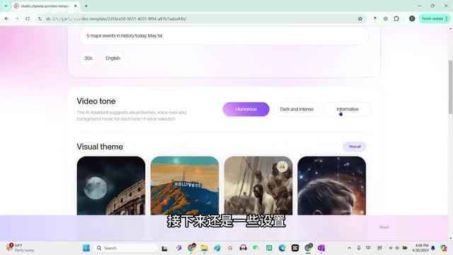 三十秒。语言,英语。今天五月一号,历史上发生的五件大事,然后生成接下来还是一些设置。这回我们选择dark and intense,黑暗和紧张的,然后是视频的风格和色调,我觉得这个比较有历史感。
