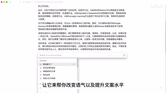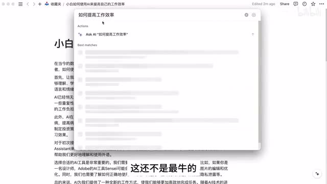 第二名,notion ai. notion ai内置于notion中,它的内核是chat g p t,所以能像使用g p t一样来使用它。例如写一个提纲,让他来帮你写完整篇文章,框选一段文字让它来帮你改变语气以及提升文案水平,或帮你翻译成其他任何语言。打开一篇文章,让他为你总结全文,甚至对几十上百篇文章开启一键总结。你还可以自定义prompt,让它按一定的规则为你取标题。
