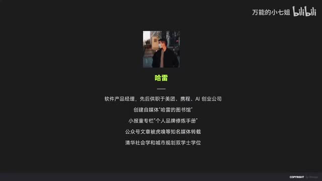 哈雷老师曾是一位软件产品经理,供职于美团、携程,目前在ai创业公司也在做个人的创业,他创建的自媒体哈雷图书馆以及福利专栏个人品牌修炼手册,而他的公众号文章被虎嗅等知名媒体转载过很多次。他本人呢是清华的社会学和城市规划学的双学士学位获得者。以下呢是哈雷老师的一些自媒体账号。以及他的文章曾经被很多次的呃转载,是一位非常优秀的写作者和a i探索者。