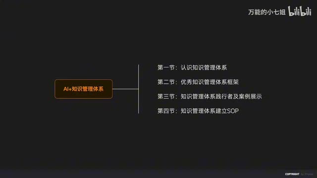 啊,什么是知识管理体系?优秀的知识管理体系的框架要是什么样的?以及。认识知识管理体系的一些践行者和一些优秀的案例。最后我们会给大家讲述知识管理体系的建立流程。而上述的四部分内容都是在呃嵌入ai工具的前提下为大家讲述的。