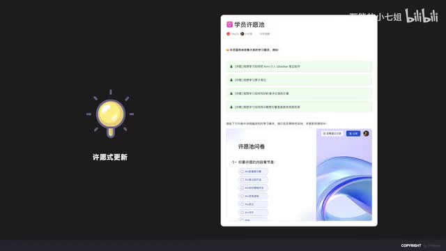同时还能够每周有一个随时跟老师的互动和反馈。那我们的更新方式是通过许愿式更新的机制,鼓励我们的学生参与到我们的课程内容当中来,确保我们的课程活跃和个性化。这个许愿的更新的方式是指我们的学员会有一个学员许愿池,大家可以通过呃提交自己在不同章节中的自己特定的学习需求的方式啊,通过问卷的方式把自己想要额外增补的学习内容啊提交到系统当中来。我们会酌情择优去给大家编制课程。
