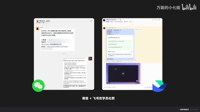 这样确保大家在学习的丰富度和个性化上面,可以得到很好的一个更新的展现。我们的社群呢是微信加飞书双学员社群的模式啊。我们的微信群主要是提供及时的答疑和交流,飞书群进行课程资料的分发和一些活动组织,确保这个社群的秩序和专注。我们所有的图文课件都会通过飞书平台去分发,方便学生们随时的访问和学习。