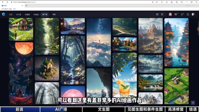 之后就能进入网站,开始使用各种绘画工具了。可以看到网站上方有着主页、a i模型、ai绘画、ai广场四个分区。首先我们来看一下这个a i广场,可以看到这里有着非常多的a i绘画作品,什么风格类型的都有。你可以根据上方的标签选择喜欢的图片类型,然后在右上方这里选择作品模型、图片集、短视频等类型,快速筛选出需要的作品。