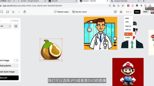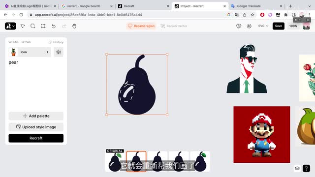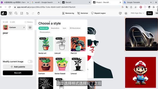 好,把这边翻译成英文,然后我们复制一下,回到这边的工作台,然后把这个英文的泥粘贴粘贴进去,然后在这边呢可以选择生成的样式。那这边我就选择第一个,然后让它生成呃这种颜色比较鲜艳的那我们选择之后,这个选择样式选择完了之后,然后点击这边的recollect,然后点一下。好,等一下这个a i就会帮我们生成一个你的图标。好,可以看到它这边已经帮我生成了两个离那在是在这里我给它移一下,移到这个正中间来。