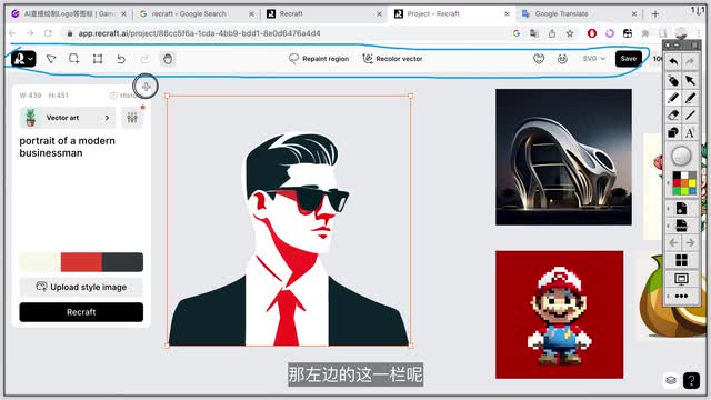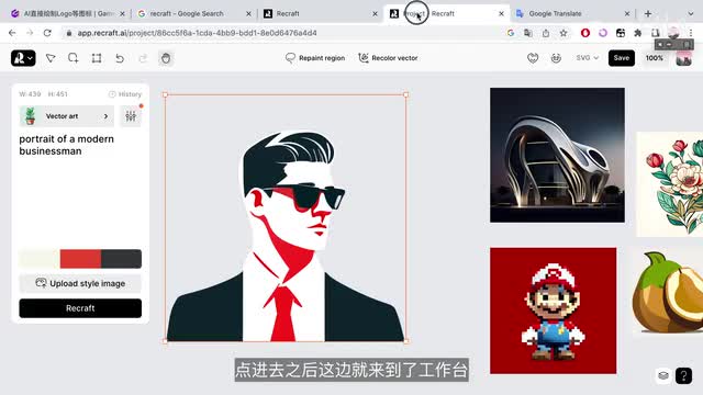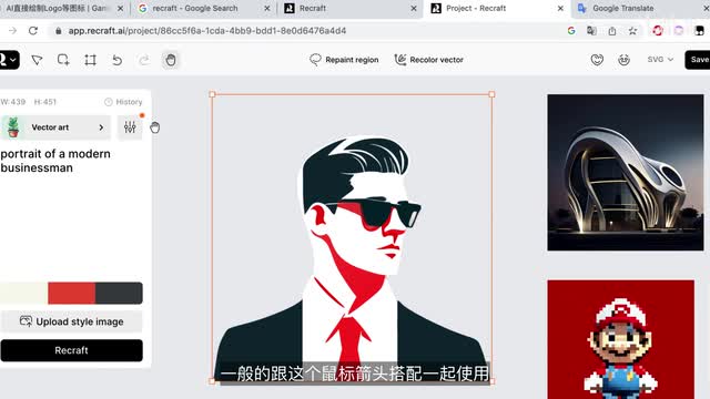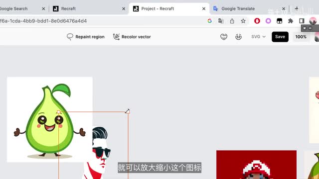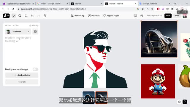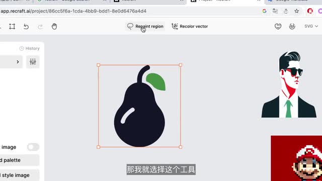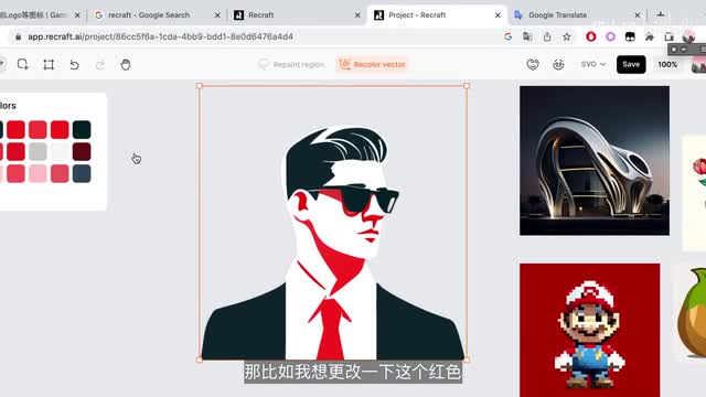 那另外的呢当然这个呢就是呃比如说ai生成图片之后,那我对这个眼镜不满意,我把这个眼镜划掉,然后这边点一下recollect,它就会重新给我们把这个图标画成其他的图片。好,那这个呢record就是呃重新更改颜色。那比如我想更改一下这个红色,那我点一下,然后呢可以看到它这边红色的这个领带就会变成绿色的对吧?好,这个是用到的两个个性化的功能,一个是重新生成某个区域,一个是重新改变颜色。那还有一个功能呢,比如这张图片,我想让它变成透明的,方便使用。