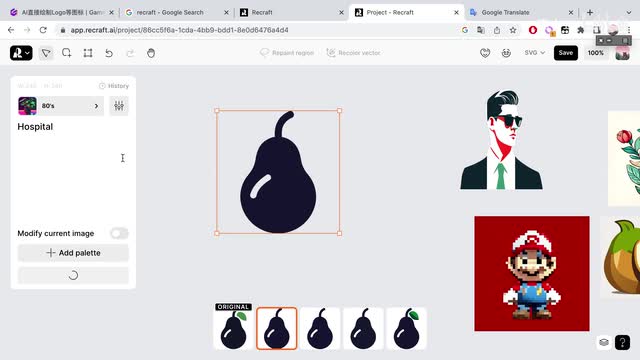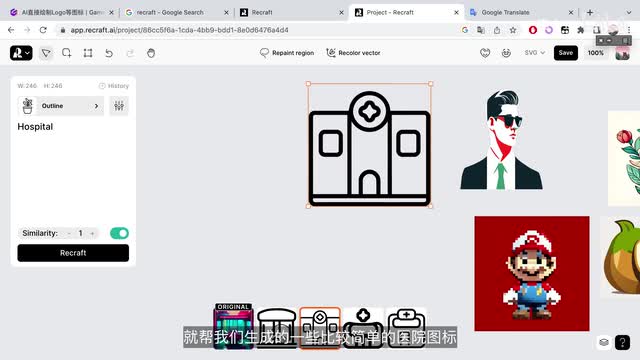 然后呢,这边是原来的图形,然后呢这个呢是有叶子的。好,这个呢是直接没有叶子的对吧?如果你对哪个地方不满意,然后让它重新画,把它呃点击一下这个,然后把重新画的地方给它画上,它就会重新帮我们画了。好,那比如呢我我是想让它生成一个呃医院的图标,那我要怎么做呢?那我就点这边的谷歌翻译,然后呢打上一个。医院,那你还可以打上其他的字啊,嗯都可以啊。