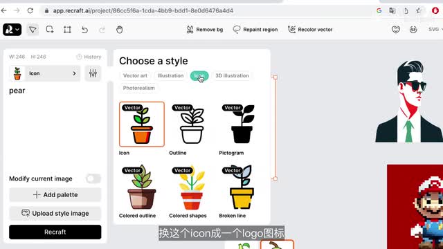 那如果我们想更改风格呢,这个是卡通风格。那我们想更改一下风格,然后变成这个,那我们换一个换这个i c o n成一个图图标。然后选择了之后呢,然后点击这个个correct重新生成。好,那等一下它又会帮我们重新生成了。