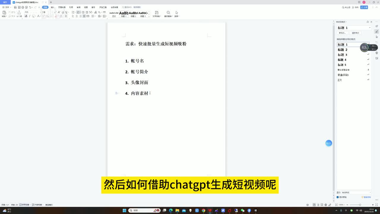 这里面呢是我们如果要做自媒体的话,肯定是先起一些账号名啊、账号简介、头像封面、内容素材这些基本的账号信息。如何借助chat g d p生成短视频呢?这里面我们首先要先生成短视频脚本。短视频脚本呢就是说我们首先要确定自己的一个方向。