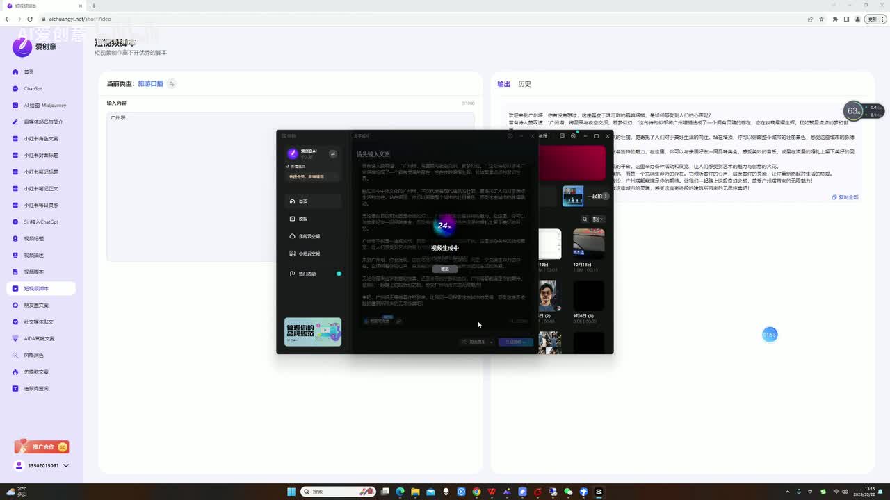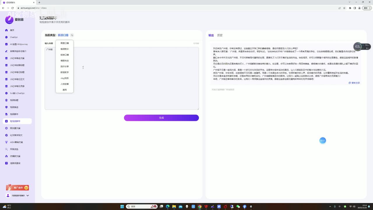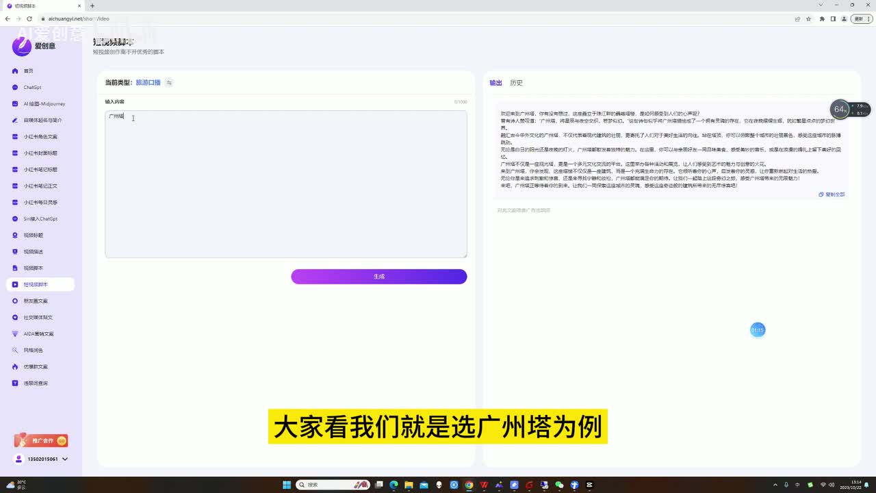 这里面我们测试呢是通过旅游口播来测试的。大家看我们就是选广州塔为例,然后它会生成一个口播文案。对不对?口播文案的情况下就是。