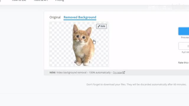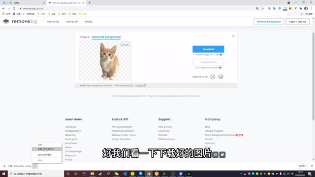 我们上传一只小猫试试,稍等片刻好了,可以看到很完美,毛发细节都还在。然后点击右侧的unload按钮,下载抠好的图片。
