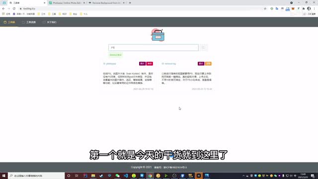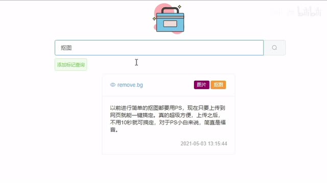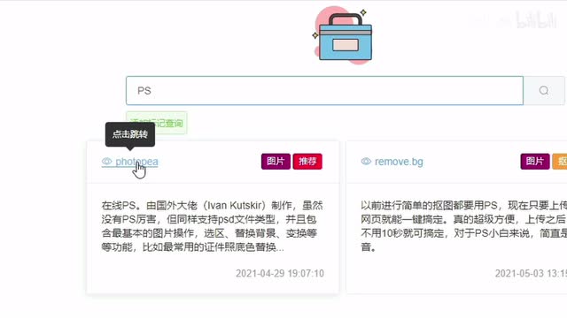 这个在线抠图网站我已经收录在工具箱里面了,输入抠图就可以查询到对应的这个抠图网站。当然刚才那个在线p s工具也在工具箱内,我们输入p s进行查询。