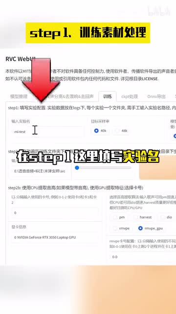 这里建议所有参数处必要完形保持默认,先用低参数跑一遍再调整。第一遍那手可以先照着我的参数。在stone这里填写说明。用歌声的训练集一定要勾选true,在step two这里填写刚才的人生数据集文件夹的路径。