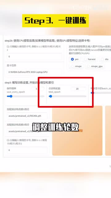注意一定不能带有英文,也不能放在桌面上。然后提取算法选择p m step three。这里根据你的数据及时长调整训练人数,大概跑二十年就可以了。训练速度根据自己的显卡配置来,最后点击一键训练,大概五分钟后提示全流程结束。
