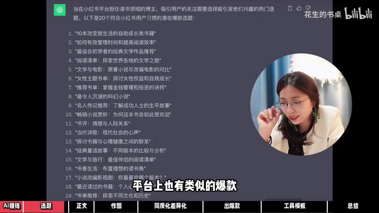 于是我给他限定了当一个读书博主,让他给我出二十个符合小红书用户习惯的读书选题。有几个还不错,平台上也有类似的爆款,完成这一部分总共耗时不到三十秒。接下来写正文,我为了一些条件,让他给我出一篇小红书文案。