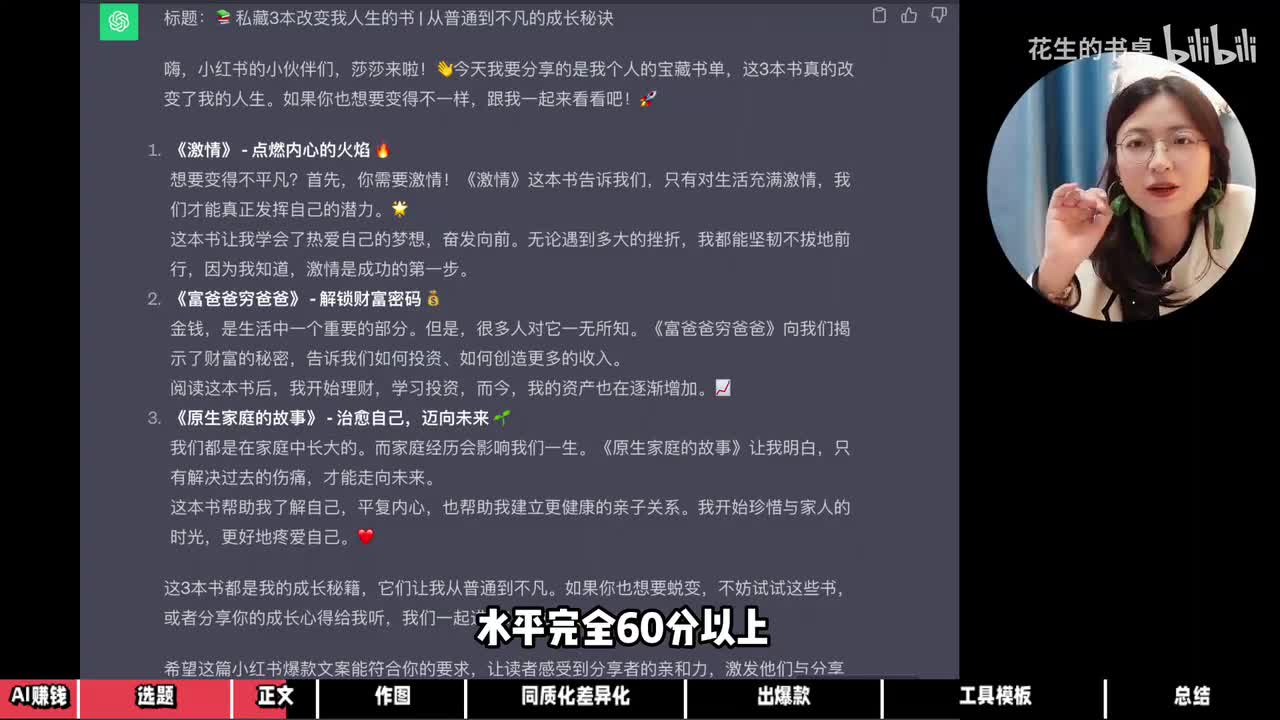 他不仅给出了一个很有网感的标题,内容也非常完整,有书籍的介绍,加了表情,还自动排版。好了,水平完全六十分以上,整个过程只用了一分钟,他给的标题我觉得不错,就直接用了。如果你要取标题,可以用这些提示词。