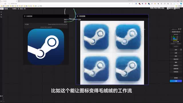 与此同时啊,这种工作流是可以随时保存并调用的。想要什么功能直接把对应的工作流拉进来,再输入输出一下就好了,中间的很多环节完全可以忽略啊,大大节省的时间。比如这个能让图标变得毛茸茸的工作流,用的时候只需要上传这样的图片就行,一键就能出效果。不想要自己搭建工作流呢,就去网上下载别人做好的,拖进来用就行。