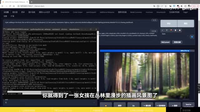 网友,提示词还不够。你还需要通过下面这个区域里面的一系列参数来定义图片的尺寸规格和生成方式。这同样也是接下来两节课我们会讨论的内容。这里你可以先参考我的做法来进行设定,这一组参数会为你生成一张十六比九尺寸的横屏壁纸。设定完毕点击右上角的生成,然后静待程序加载。片刻之后你就得到了一张女孩在丛林里漫步的插画风景图了。这就是你用ai画出的第一幅作品了,对它的效果你满意吗?哦,女孩为什么是背对着我们的呢?这个时候你可以把自己想象成一位无情的甲方向a i沟通你的需求和他需要改进的地方。你对a i说的话其实就是这些提示词。如果他没能达到你要的效果,就再对他多逼逼几句,补充说明到位就好。