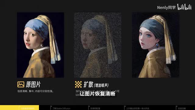 我们虽然把这个过程称之为ai绘画,但实际上它并不是像人类画图一样,打草稿、勾线描边,再去上色,对细节加工这样按部就班的去完成一幅画作的。他采取了一个人类不曾设想的路径,就是diffusion扩散。我想到了一个非常形象的方式来向你解释它的原理,这是一幅世界名画,荷兰画家就hanny premiere的带头巾的少女,如果让你把这幅画用今天流行的二次元动漫风格重新绘制一遍,你做得到吗?现在尝试着把你的眼睛眯到只剩一条缝,去看它它是不是变得模糊了。保持这个状态,想象着他正在逐渐变得二次元。随后慢慢睁开眼睛,你有意识到这幅画已经变得完全不同了吗?这就是一个扩散模型去工作的基本流程了。在这个例子里,你可以将执行规划指令的a i带入你自己扮演的角色。首先它会将图片通过增加噪声的方式进行扩散,也就是让它变得更模糊,就像是眯起眼睛的你一样。当内容模糊了以后,你就有更充分的空间去从它原本的形态抽离,并且想象它是否能变成其他模样。a i也是如此,通过深度学习的方式,它将很多不同的图像都转换成了这样的抽象内容。