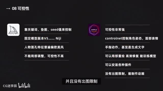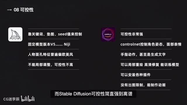 只有固定的几个版本,例如是五点一、五点二、d g等。声称的人物面孔特征普遍偏欧美风,不能局部调整细节,可控性并不高,而stability deficient可控性简直强到离谱。你可以通过大名鼎鼎的controlled来控制角色的姿态、面部表情、手指动作,甚至是生成文字。可以通过局部重绘in paint来修改细节、替换衣服。