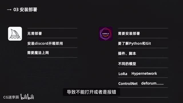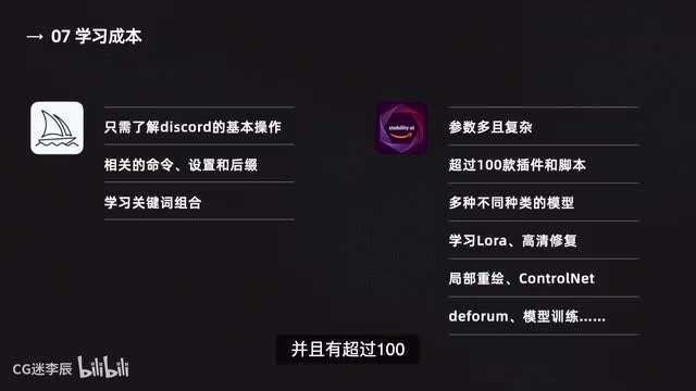 学习成本mitra y只需要了解disco的基本操作,还有相关的命令设置和后缀,然后学习关键词的组合基本就没有问题了,整个学习过程并不需要太久,这些在前面的教程都有给大家讲解。而stable diffusion可以调整的参数要比middleton要多出很多。并且有超过一百款的插件和脚本可以安装,每款插件和脚本都有不同的参数需要了解。还有一大堆不同类型的模型需要下载和安装,还要学习lura高清修复、局部重绘、control l defarr a模型训练等等,这些都需要花费很多时间去研究学习的,学习成本要比majority高出很多。