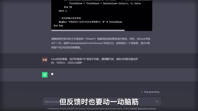 请撰写v b a代码来计算a等级的客户在二月份实现的总销售额是多少。当我们把a i提供的代码输入excel运行后,a i给予了我这样的报错。没关系,我们可以把这个问题反馈给a i但反馈时也要动一动脑筋,为什么会类型不匹配?我觉得大概率会是a列的日期出了问题。excel的日期格式一般都是使用斜杠作为分隔符,因此我告诉a i excel的反馈是运行错误。十三类型不匹配,请调整代码。