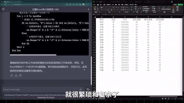 我们运行一下,发现excel执行的操作效果也非常好。但你觉得这样做出来的有些丑,不希望姓名、性别、学号也被标注上颜色。此时我们也可以直接把这个需求告诉g p t,让其重新生成新的v b a代码,如你的v b a代码里把a b c列也标注上了颜色,我不希望有此效果,请重新调整v b a代码。我们再把g p t调整后的代码粘贴上去,发现完美达到了我们的要求。因此如果g p t给予的结果并不满意,我们直接给出它指令,让其再调整就好在编写v b a代码的时候,g p t也给出了具体的步骤,可以辅助指导我们如何编。