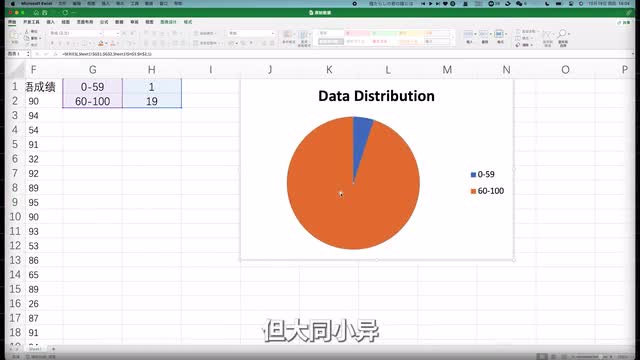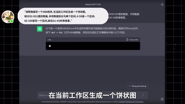如需要图表展现语文及格与不及格学生的比例,就需要花时间去调对应的数据源。如果是用chat g p t的,很简单,我们无需一步步操作,只需把需求给a i就可以了。比如我可以直接对a i提问,请帮我编写一个v b a程序,在当前工作区生成一个饼状图,统计第二第二十一里的数据,并将数据划分为两个区间,零到五十九是一个区间,六十到一百是另一个区间。但在g一到h r的表格里,我们把这个程序在excel中运行。先看看效果,你看一张以我们要求分类的饼状图就完成了。