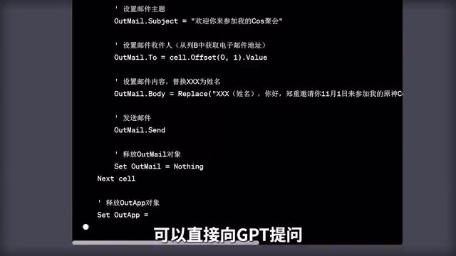 如果代码无法正确运行,当excel基于报错的时候,我们也可以把报错原因发送给g p t,让其修改,再运行新的代码,基本问题都能很好解决。再比如这个表格里有四十个数据,我们可以让g p t编写一个代码来删除数据中第一列的重复项,excel瞬间完成了操作。这是四十个人的名字以及他们的联系邮箱。如果我们需要给每一个人发送一份邮件,传统方法就是一个人一个人的打字,然后再发送。而在ai的帮助下,我们可以让其撰写一个excel宏来自动发送电子邮件,并告知使用某一固定主题使用什么样的文本撰写邮件,注意该功能需要配置outlook邮箱运行成功后就会自动发送邮件,比如,请帮我撰写一个excel宏用来发送电子邮件,使用此主题,欢迎你来参加我的cos聚会,使用以下文本,叉叉叉,你好。