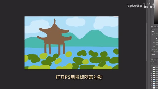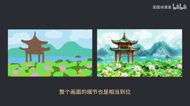 手绘图片转会夏天到了,我想生成一张荷花布满湖面,远处有一座亭子,背景为雪山白云的场景。打开p s用鼠标随意勾勒,你们看简直是愁死我了,这要是被领导看到不得呼死我。