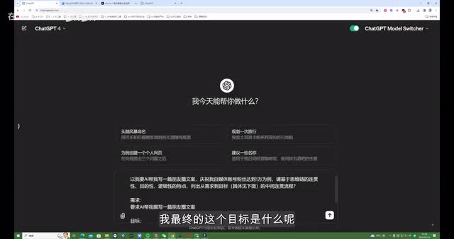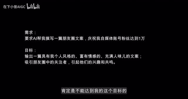 好的,我们回归主题。还是以让ai帮我写朋友圈文案?这个。为例子啊。那我的一个请求是什么呢?我想让ai帮助我写一条朋友圈文案。我最终的这个目标是什么呢?那其实我最后的目标是让ai帮助我创建一篇有吸引力的,并且呢能够反映我个人风格的这样一条朋友圈文案。