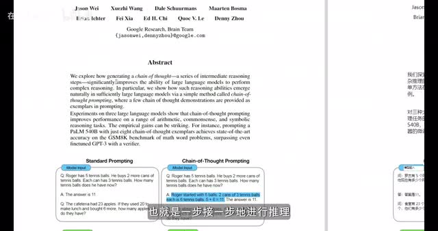 思维链这个概念呢最早是由现任的谷歌大脑研究员jason we在二零二二年提出的那其中他有一个发现呢。a i呢可以通过模仿人类解决问题时的这个思考过程。也就是一步接一步的进行推理,这个输出质量得到了显著的提升。论文当中呢介绍了两个算术例子。那我们可以看到这个地方没有经过思维链的一个提示的情况之下的话,那大模型计算出来的这个结果呢是错误的。