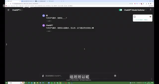 它可以通过理解上下文和计算下一个词出现的这个概率呢来选择词汇。讲起来稍微有一点抽象啊,那我举个例子,比如说我给他一个指令,今天的天气真好,我打算去去干嘛?我不讲,我直接发送给他。那大家可以看到哈这个地方的天气好呢,它是一个非常积极的一个情景是吧?以及这个地方的打算去呢,他可能会暗示接下来是一个地点或者是活动。这个时候我们把这个指令呢发送给g p t。基于训练过的这个模型呢a i会考虑可能会有数百个这个接续的词汇或者是短语,比如说海边公园散步等等。