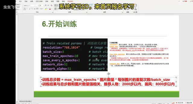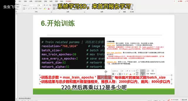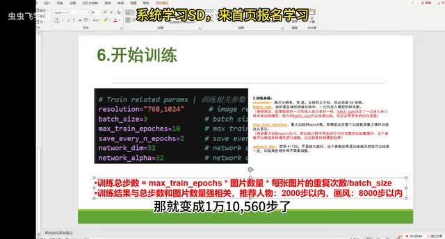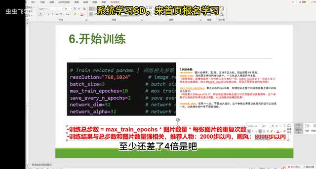 那这里我们又回到呃之前讲训练时候的一些参数了。好比如说这里哈嗯那我们仔细看一下啊,呃我们盖这个是十对吧?十乘以二十二就多少两百二,然后呢乘以十二是多少呢?得到是两千六百四。那按照我推荐的这个不这个这个步数来说哈,我们画风要求是八百步以呃八千步以内。那人物是两千步以内。